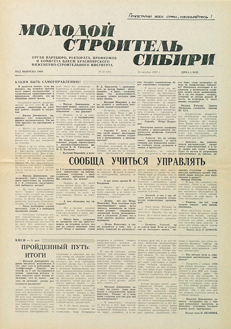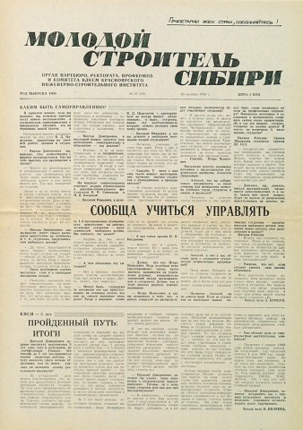 Библиографическое описание:Молодой строитель Сибири : газета/ Красноярский инженерно-строительный институт. - Красноярск : КИСИ, 1986 - - [1992] 1987г. N 30 (69) (23 октября)