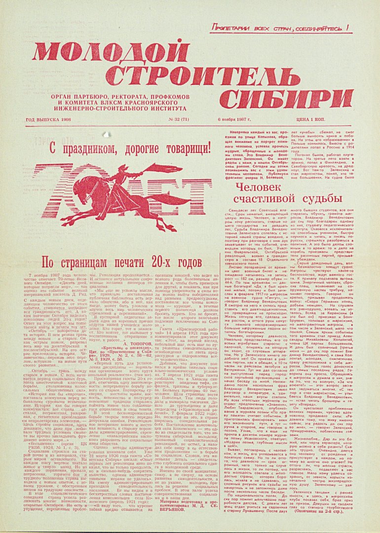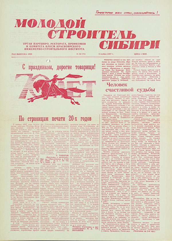 Библиографическое описание:Молодой строитель Сибири : газета/ Красноярский инженерно-строительный институт. - Красноярск : КИСИ, 1986 - - [1992] 1987г. N 32 (71) (6 ноября)