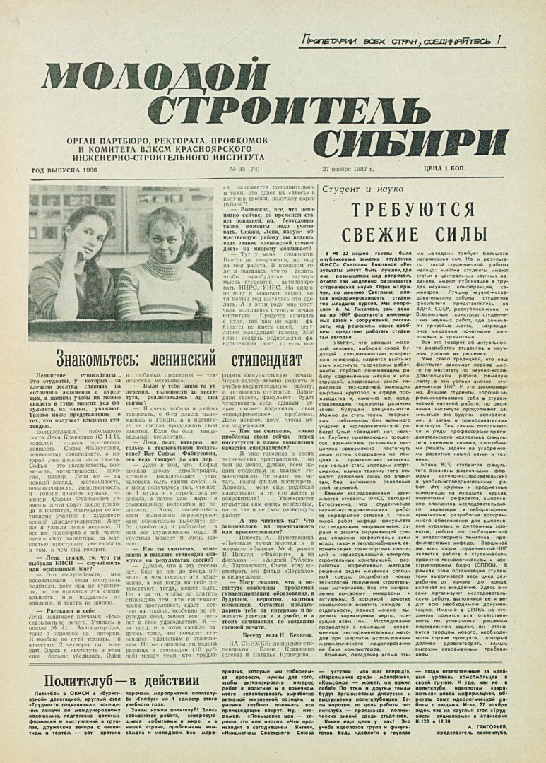 Библиографическое описание:Молодой строитель Сибири : газета/ Красноярский инженерно-строительный институт. - Красноярск : КИСИ, 1986 - - [1992] 1987г. N 35 (74) (27 ноября)