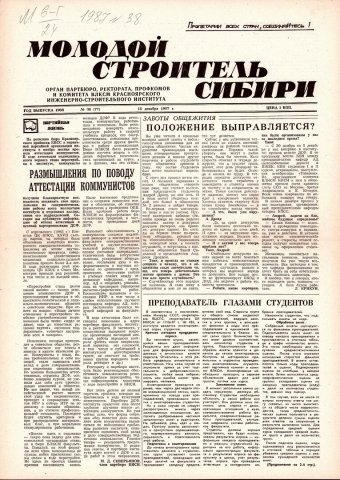 Библиографическое описание:Молодой строитель Сибири : газета/ Красноярский инженерно-строительный институт. - Красноярск : КИСИ, 1986 - - [1992] 1987г. N 38 (77) (18 декабря)