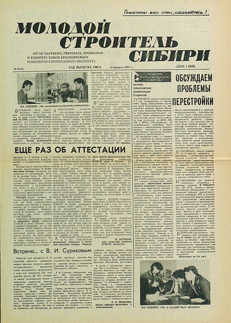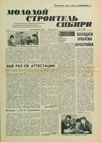 Библиографическое описание:Молодой строитель Сибири : газета/ Красноярский инженерно-строительный институт. - Красноярск : КИСИ, 1986 - - [1992] 1987г. N 6 (44) (13 февраля)