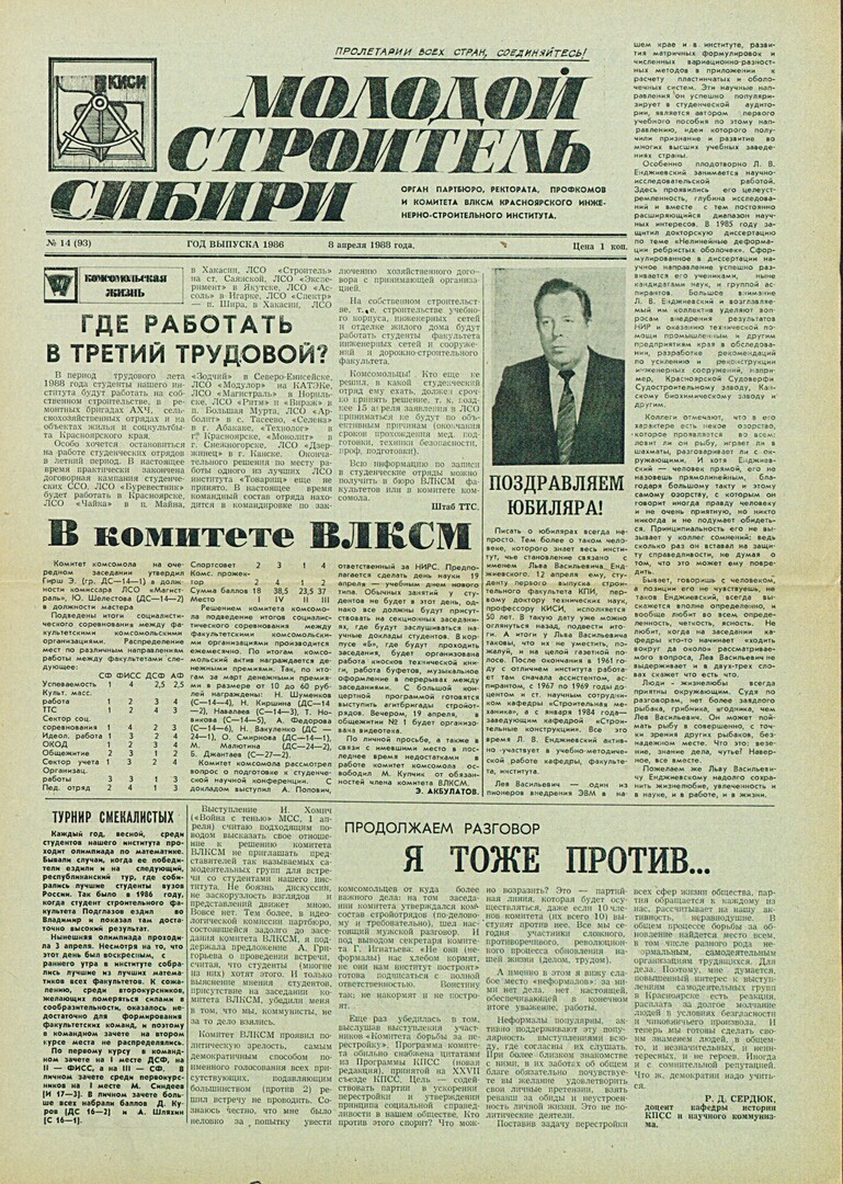 Библиографическое описание:Молодой строитель Сибири : газета/ Красноярский инженерно-строительный институт. - Красноярск : КИСИ, 1986 - - [1992] 1988г. N 14 (93) (8 апреля)