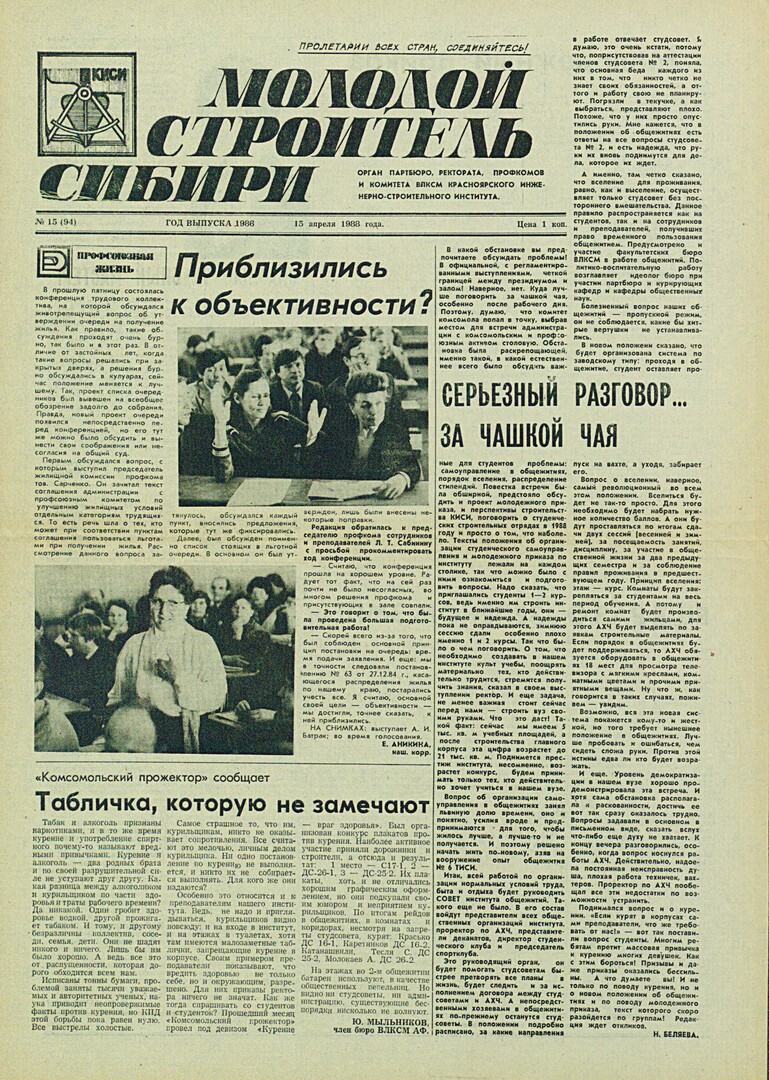 Библиографическое описание:Молодой строитель Сибири : газета/ Красноярский инженерно-строительный институт. - Красноярск : КИСИ, 1986 - - [1992] 1988г. N 15 (94) (15 апреля)