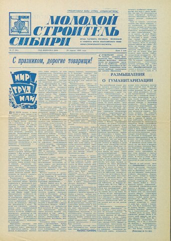 Библиографическое описание:Молодой строитель Сибири : газета/ Красноярский инженерно-строительный институт. - Красноярск : КИСИ, 1986 - - [1992] 1988г. N 17 (96) (29 апреля)