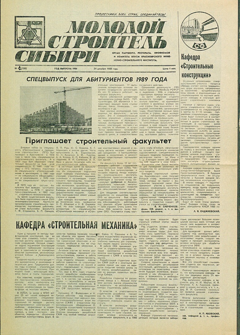 Библиографическое описание:Молодой строитель Сибири : газета/ Красноярский инженерно-строительный институт. - Красноярск : КИСИ, 1986 - - [1992] 1988г. N 42 (120) (24 декабря)