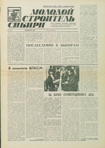 Библиографическое описание:Молодой строитель Сибири : газета/ Красноярский инженерно-строительный институт. - Красноярск : КИСИ, 1986 - - [1992] 1989г. N 13 (134) (7 апреля)