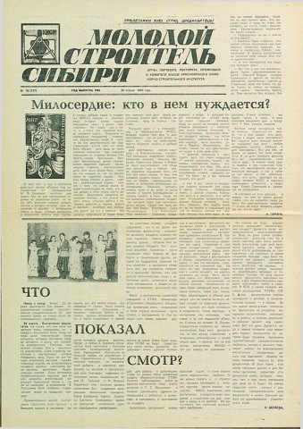 Библиографическое описание:Молодой строитель Сибири : газета/ Красноярский инженерно-строительный институт. - Красноярск : КИСИ, 1986 - - [1992] 1989г. N 16 (137) (28 апреля)