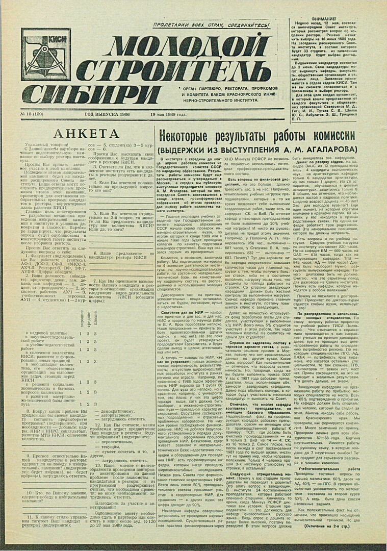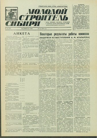 Библиографическое описание:Молодой строитель Сибири : газета/ Красноярский инженерно-строительный институт. - Красноярск : КИСИ, 1986 - - [1992] 1989г. N 18 (139) (19 мая)