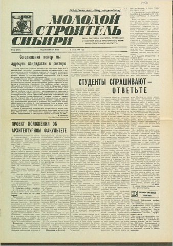 Библиографическое описание:Молодой строитель Сибири : газета/ Красноярский инженерно-строительный институт. - Красноярск : КИСИ, 1986 - - [1992] 1989г. N 20 (141) (2 июня)