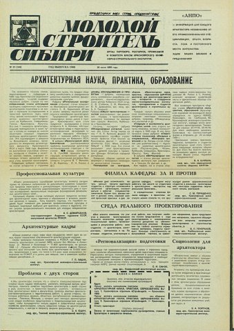 Библиографическое описание:Молодой строитель Сибири : газета/ Красноярский инженерно-строительный институт. - Красноярск : КИСИ, 1986 - - [1992] 1989г. N 23 (144) (30 июня)