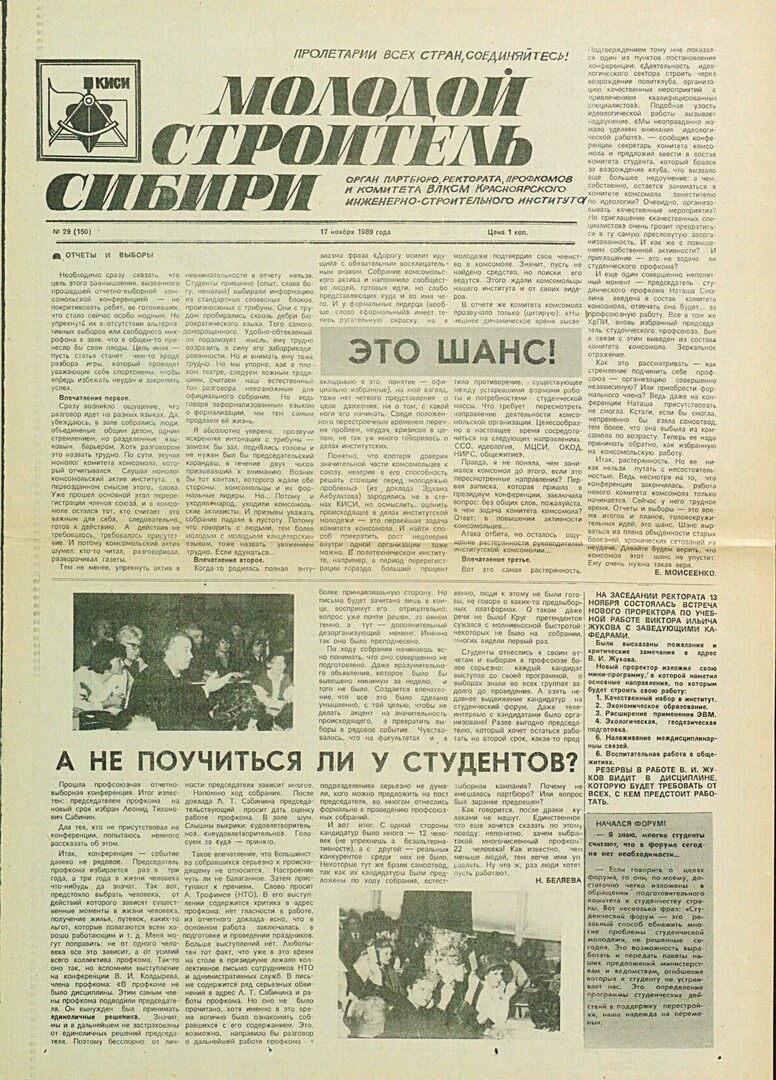 Библиографическое описание:Молодой строитель Сибири : газета/ Красноярский инженерно-строительный институт. - Красноярск : КИСИ, 1986 - - [1992] 1989г. N 29 (150) (17 ноября)