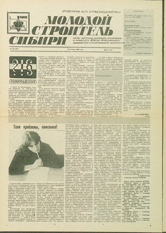 Библиографическое описание:Молодой строитель Сибири : газета/ Красноярский инженерно-строительный институт. - Красноярск : КИСИ, 1986 - - [1992] 1989г. N 30 (151) (24 ноября)