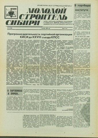 Библиографическое описание:Молодой строитель Сибири : газета/ Красноярский инженерно-строительный институт. - Красноярск : КИСИ, 1986 - - [1992] 1989г. N 31 (152) (1 декабря)