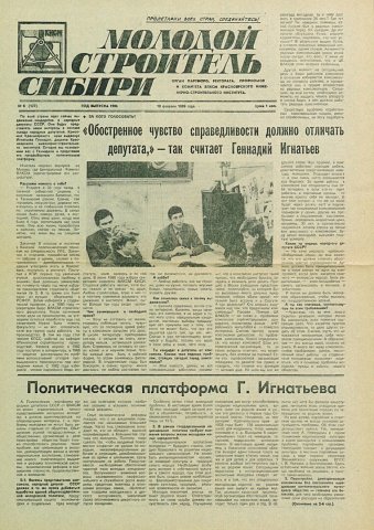 Библиографическое описание:Молодой строитель Сибири : газета/ Красноярский инженерно-строительный институт. - Красноярск : КИСИ, 1986 - - [1992] 1989г. N 6 (127) (10 февраля)