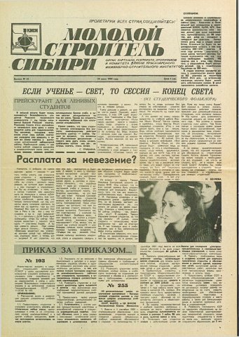 Библиографическое описание:Молодой строитель Сибири : газета/ Красноярский инженерно-строительный институт. - Красноярск : КИСИ, 1986 - - [1992] 1990г. N 12 (29 июня)