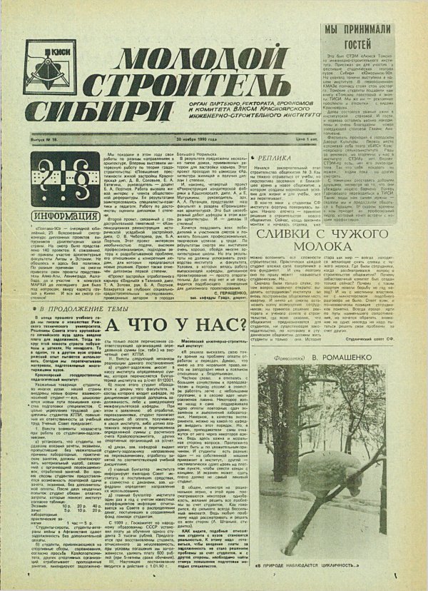 Библиографическое описание:Молодой строитель Сибири : газета/ Красноярский инженерно-строительный институт. - Красноярск : КИСИ, 1986 - - [1992] 1990г. N 18 (30 ноября)