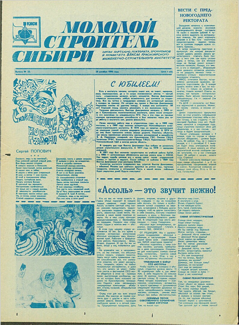 Библиографическое описание:Молодой строитель Сибири : газета/ Красноярский инженерно-строительный институт. - Красноярск : КИСИ, 1986 - - [1992] 1990г. N 22 (28 декабря)