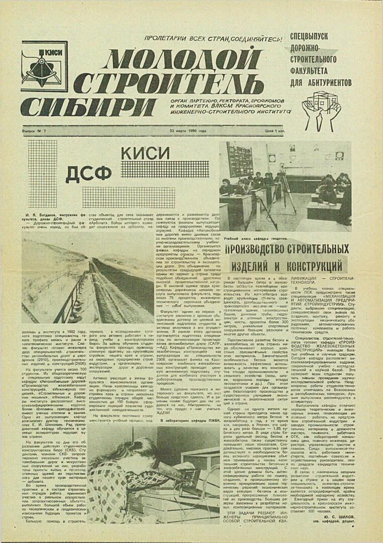 Библиографическое описание:Молодой строитель Сибири : газета/ Красноярский инженерно-строительный институт. - Красноярск : КИСИ, 1986 - - [1992] 1990г. N 7 (23 марта)