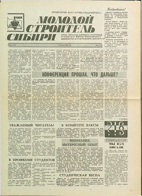 Библиографическое описание:Молодой строитель Сибири : газета/ Красноярский инженерно-строительный институт. - Красноярск : КИСИ, 1986 - - [1992] 1990г. N 8 (13 апреля)