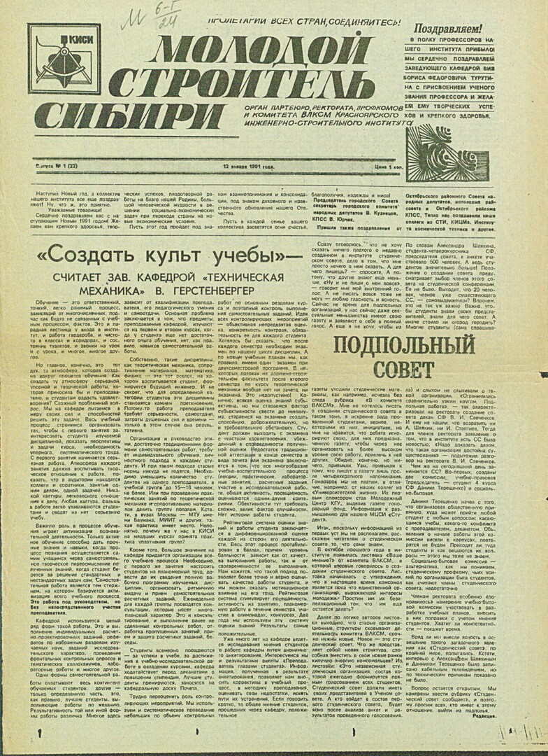 Библиографическое описание:Молодой строитель Сибири : газета/ Красноярский инженерно-строительный институт. - Красноярск : КИСИ, 1986 - - [1992] 1991г. N 1 (23) (12 января)