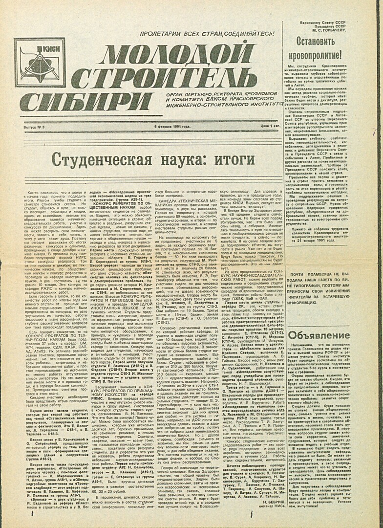 Библиографическое описание:Молодой строитель Сибири : газета/ Красноярский инженерно-строительный институт. - Красноярск : КИСИ, 1986 - - [1992] 1991г. N 3 (6 февраля)