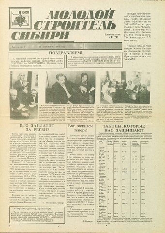 Библиографическое описание:Молодой строитель Сибири : газета/ Красноярский инженерно-строительный институт. - Красноярск : КИСИ, 1986 - - [1992] 1991г. N 3* (30 октября)