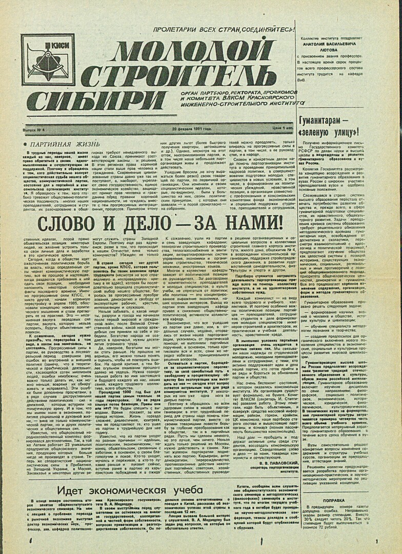 Библиографическое описание:Молодой строитель Сибири : газета/ Красноярский инженерно-строительный институт. - Красноярск : КИСИ, 1986 - - [1992] 1991г. N 4 (20 февраля)