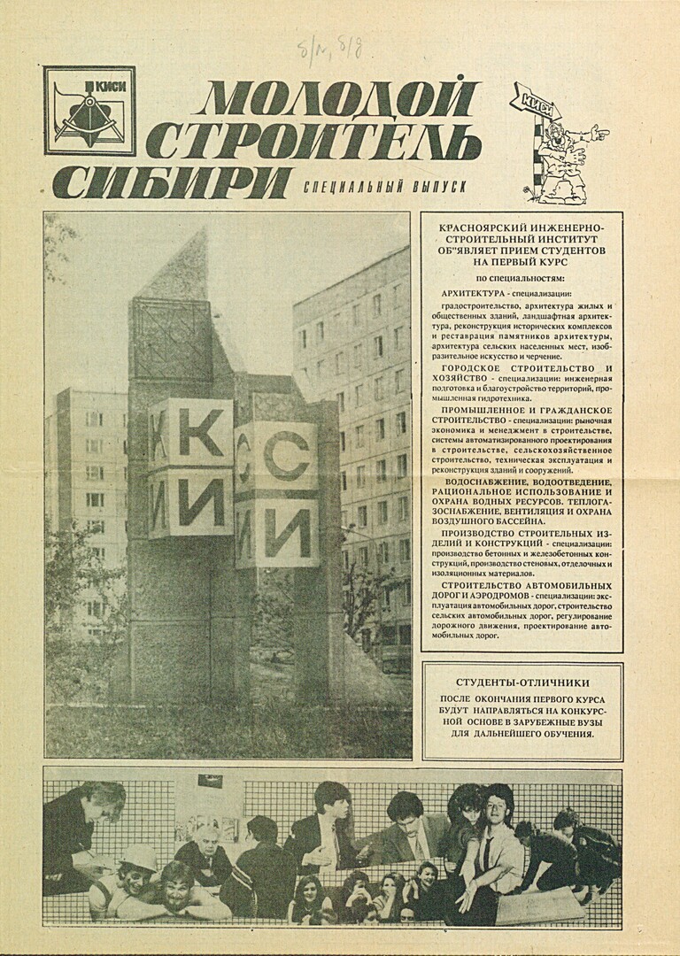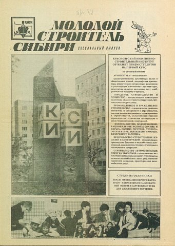 Библиографическое описание:Молодой строитель Сибири : газета/ Красноярский инженерно-строительный институт. - Красноярск : КИСИ, 1986 - - [1992] 1992г. Спецвып.