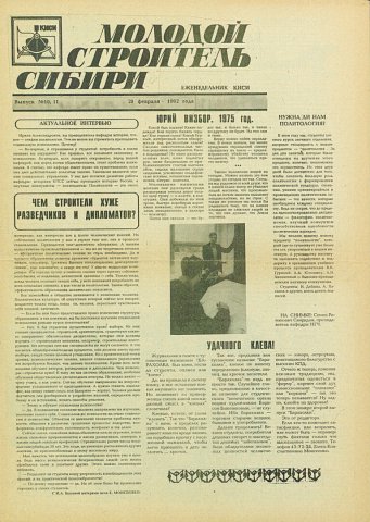 Библиографическое описание:Молодой строитель Сибири : газета/ Красноярский инженерно-строительный институт. - Красноярск : КИСИ, 1986 - - [1992] 1992г. N 10/11 (20 февраля)