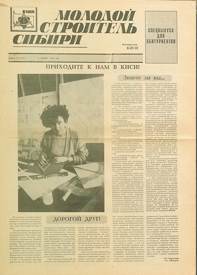Библиографическое описание:Молодой строитель Сибири : газета/ Красноярский инженерно-строительный институт. - Красноярск : КИСИ, 1986 - - [1992] 1992г. N 14/15 (3 апреля)