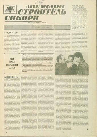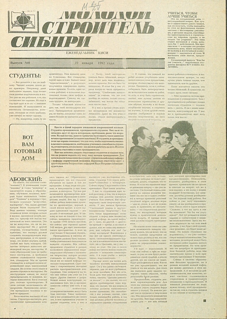 Библиографическое описание:Молодой строитель Сибири : газета/ Красноярский инженерно-строительный институт. - Красноярск : КИСИ, 1986 - - [1992] 1992г. N 9 (22 января)
