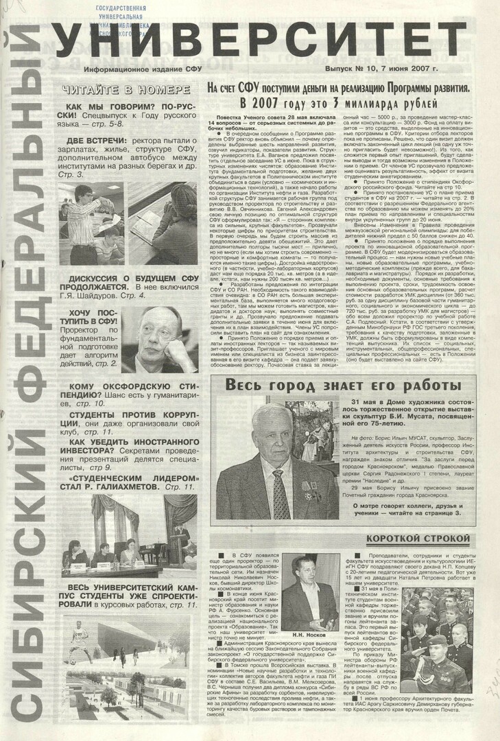 Библиографическое описание:Новая университетская жизнь : газета/ Сиб. федер. ун-т. - Красноярск, 2007 - . - ISSN 2222-5560 2007г. N 10* (7 июня)
