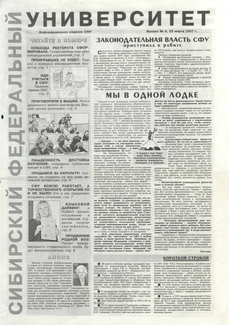 Новая университетская жизнь : газета/ Сиб. федер. ун-т. - Красноярск, 2007 - . - ISSN 2222-5560 2007г. N 4* (22 марта) Полный текст ( 32.8 Мб; PDF). Ресурс свободного доступа