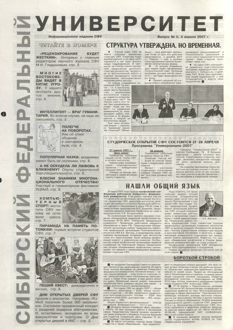 Новая университетская жизнь : газета/ Сиб. федер. ун-т. - Красноярск, 2007 - . - ISSN 2222-5560 2007г. N 5* (4 апреля) Полный текст ( 32.9 Мб; PDF). Ресурс свободного доступа