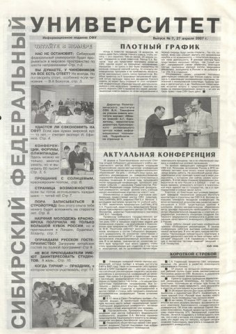 Новая университетская жизнь : газета/ Сиб. федер. ун-т. - Красноярск, 2007 - . - ISSN 2222-5560 2007г. N 7* (27 апреля) Полный текст ( 47.0 Мб; PDF). Ресурс свободного доступа