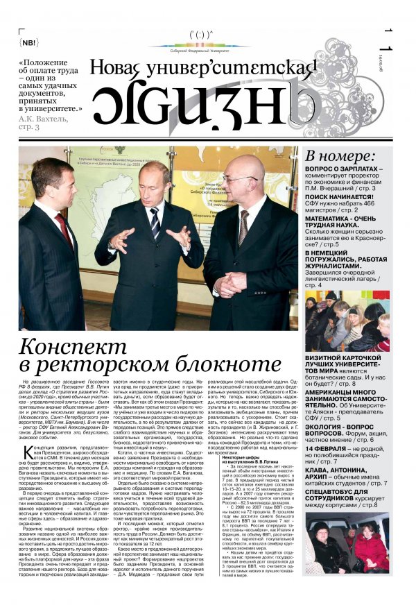 Новая университетская жизнь : газета/ Сиб. федер. ун-т. - Красноярск, 2007 - . - ISSN 2222-5560 2008г. N 1 (13) (14 февраля) Полный текст ( 1.9 Мб; PDF). Ресурс свободного доступа