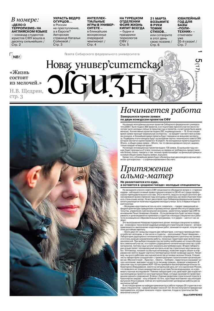 Новая университетская жизнь : газета/ Сиб. федер. ун-т. - Красноярск, 2007 - . - ISSN 2222-5560 2008г. N 5 (17) (20 марта) Полный текст ( 1.7 Мб; PDF). Ресурс свободного доступа