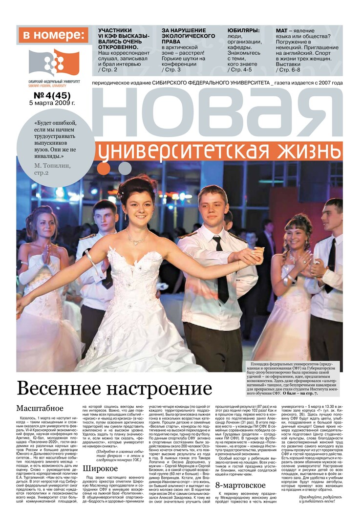 Новая университетская жизнь : газета/ Сиб. федер. ун-т. - Красноярск, 2007 - . - ISSN 2222-5560 2009г. N 4 (45) (5 марта) Полный текст ( 1.0 Мб; PDF). Ресурс свободного доступа