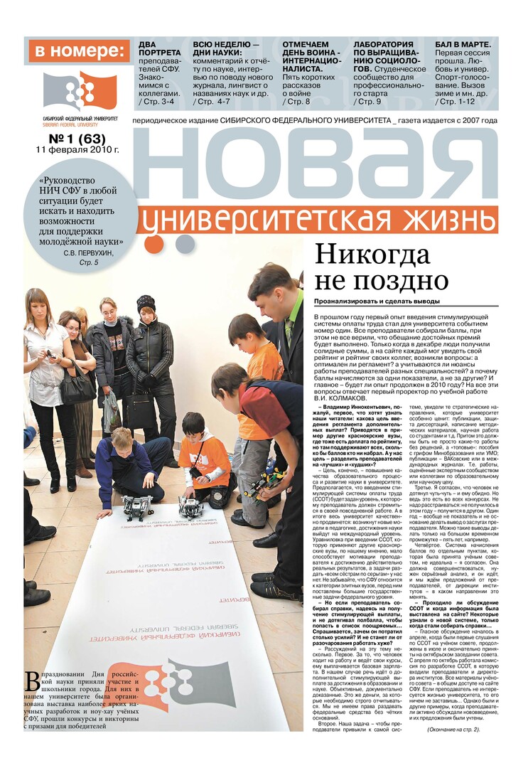 Новая университетская жизнь : газета/ Сиб. федер. ун-т. - Красноярск, 2007 - . - ISSN 2222-5560 2010г. N 1 (63) (11 февраля) Полный текст ( 1.5 Мб; PDF). Ресурс свободного доступа