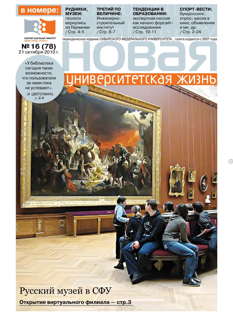Новая университетская жизнь : газета/ Сиб. федер. ун-т. - Красноярск, 2007 - . - ISSN 2222-5560 2010г. N 16 (78) (21 октября) Полный текст ( 1.8 Мб; PDF). Ресурс свободного доступа