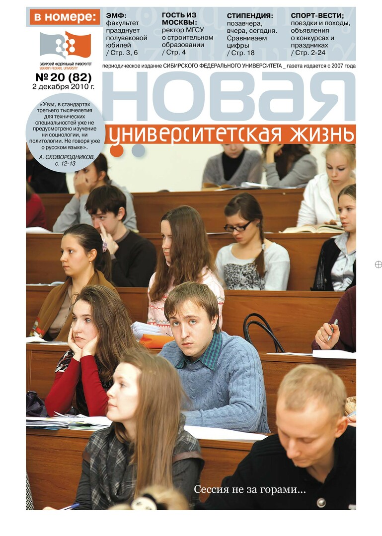Новая университетская жизнь : газета/ Сиб. федер. ун-т. - Красноярск, 2007 - . - ISSN 2222-5560 2010г. N 20 (82) (2 декабря) Полный текст ( 2.3 Мб; PDF). Ресурс свободного доступа