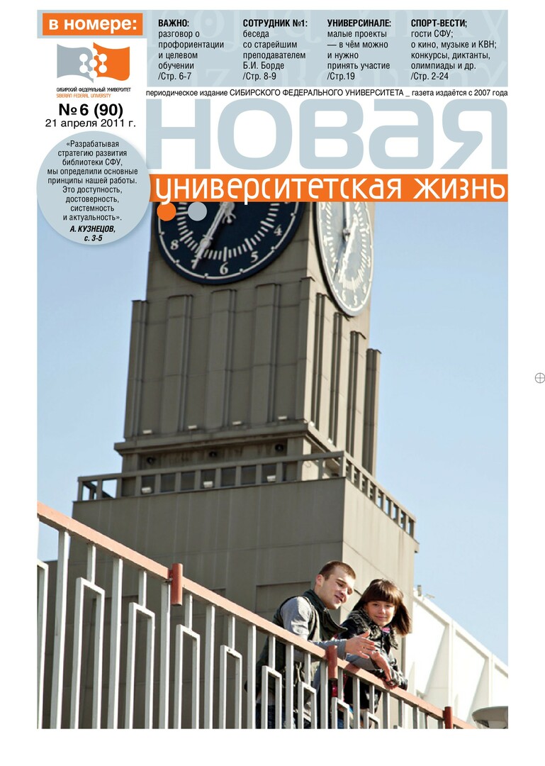 Новая университетская жизнь : газета/ Сиб. федер. ун-т. - Красноярск, 2007 - . - ISSN 2222-5560 2011г. N 6 (90) (21 апреля) Полный текст ( 2.2 Мб; PDF). Ресурс свободного доступа