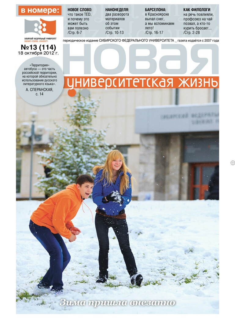 Новая университетская жизнь : газета/ Сиб. федер. ун-т. - Красноярск, 2007 - . - ISSN 2222-5560 2012г. N 13 (114) (18 октября) Полный текст ( 2.8 Мб; PDF). Ресурс свободного доступа