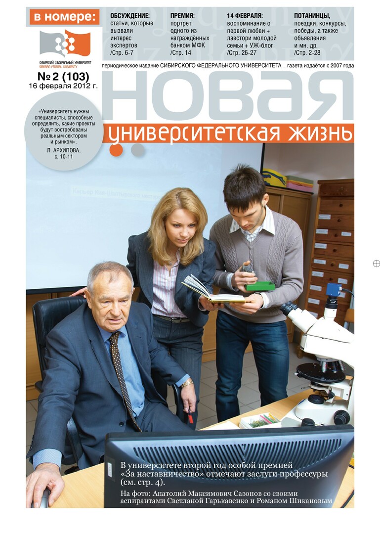 Новая университетская жизнь : газета/ Сиб. федер. ун-т. - Красноярск, 2007 - . - ISSN 2222-5560 2012г. N 2 (103) (16 февраля) Полный текст ( 2.5 Мб; PDF). Ресурс свободного доступа