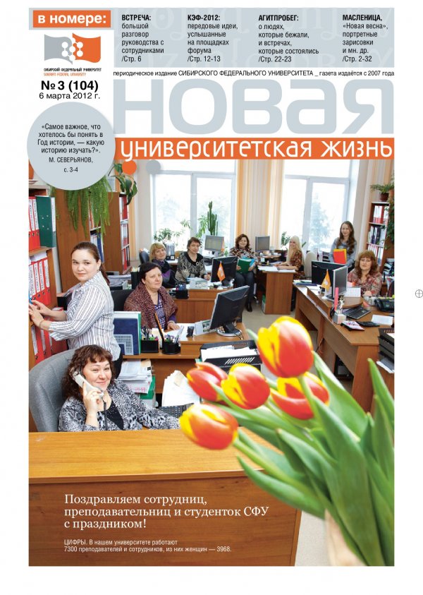 Новая университетская жизнь : газета/ Сиб. федер. ун-т. - Красноярск, 2007 - . - ISSN 2222-5560 2012г. N 3 (104) (6 марта) Полный текст ( 3.7 Мб; PDF). Ресурс свободного доступа