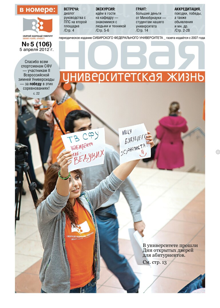 Новая университетская жизнь : газета/ Сиб. федер. ун-т. - Красноярск, 2007 - . - ISSN 2222-5560 2012г. N 5 (106) (5 апреля) Полный текст ( 11.5 Мб; PDF). Ресурс свободного доступа