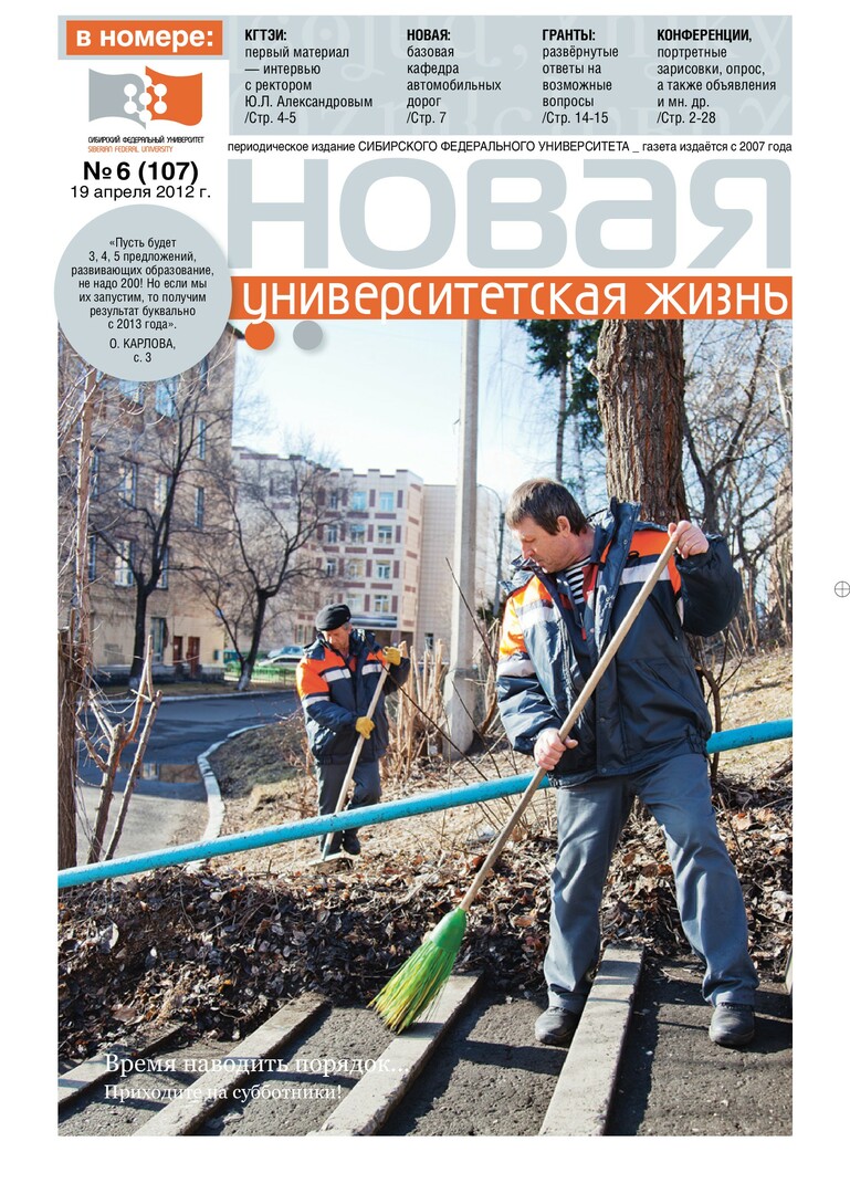 Новая университетская жизнь : газета/ Сиб. федер. ун-т. - Красноярск, 2007 - . - ISSN 2222-5560 2012г. N 6 (107) (19 апреля) Полный текст ( 3.0 Мб; PDF). Ресурс свободного доступа