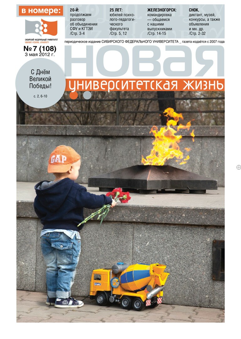 Новая университетская жизнь : газета/ Сиб. федер. ун-т. - Красноярск, 2007 - . - ISSN 2222-5560 2012г. N 7 (108) (3 мая) Полный текст ( 2.4 Мб; PDF). Ресурс свободного доступа