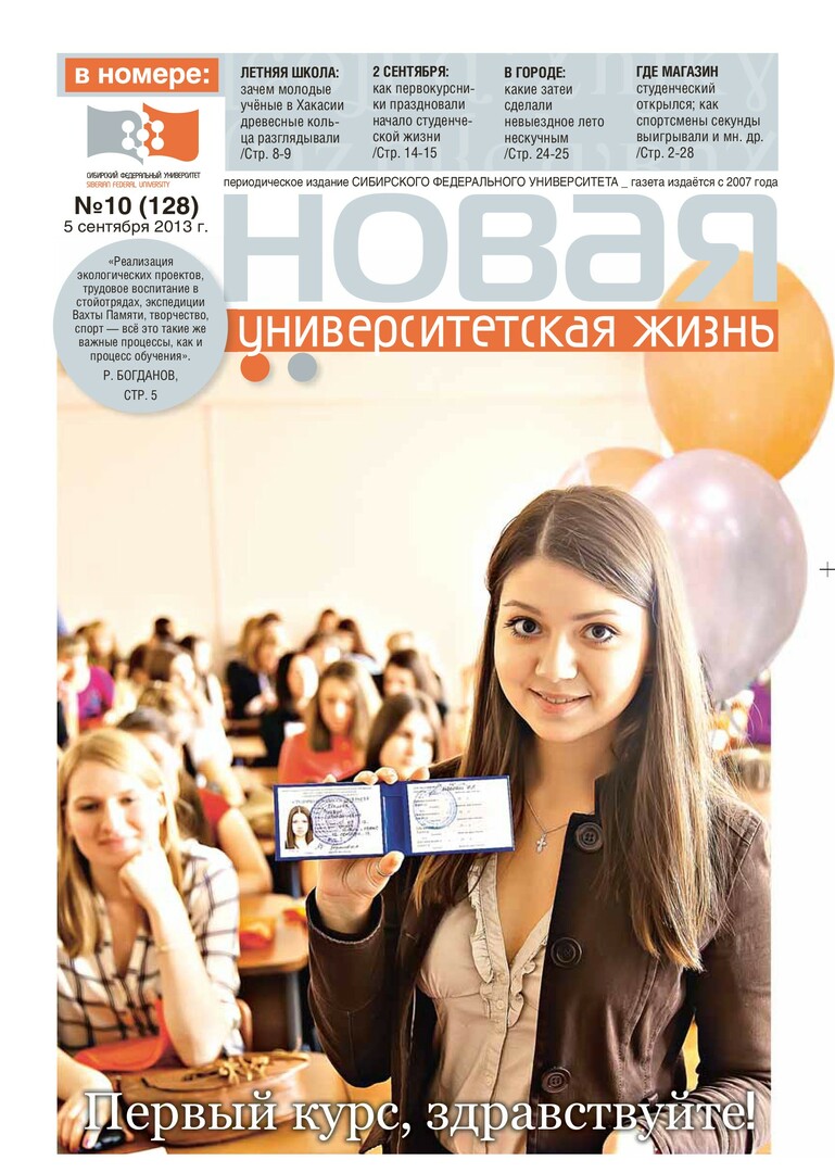 Новая университетская жизнь : газета/ Сиб. федер. ун-т. - Красноярск, 2007 - . - ISSN 2222-5560 2013г. N 10 (128) (5 сентября) Полный текст ( 2.1 Мб; PDF). Ресурс свободного доступа