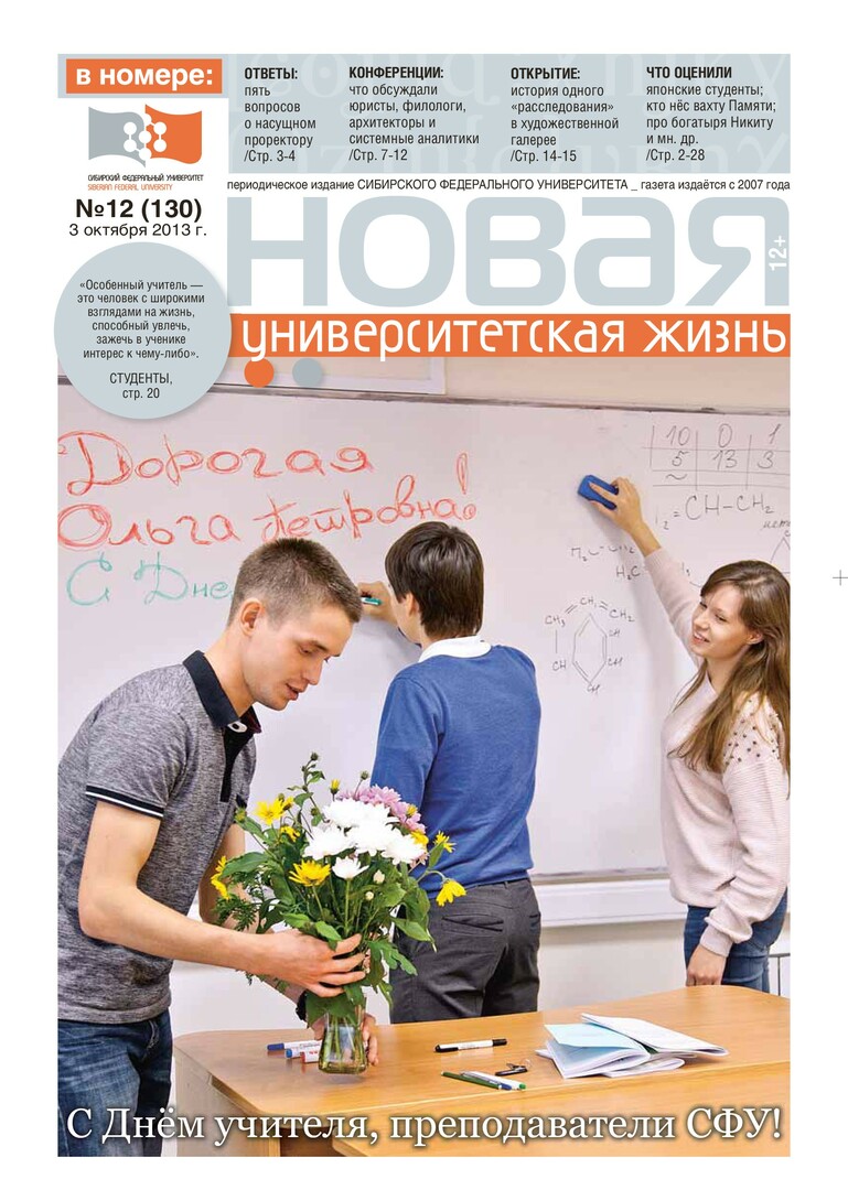 Новая университетская жизнь : газета/ Сиб. федер. ун-т. - Красноярск, 2007 - . - ISSN 2222-5560 2013г. N 12 (130) (3 октября) Полный текст ( 1.7 Мб; PDF). Ресурс свободного доступа